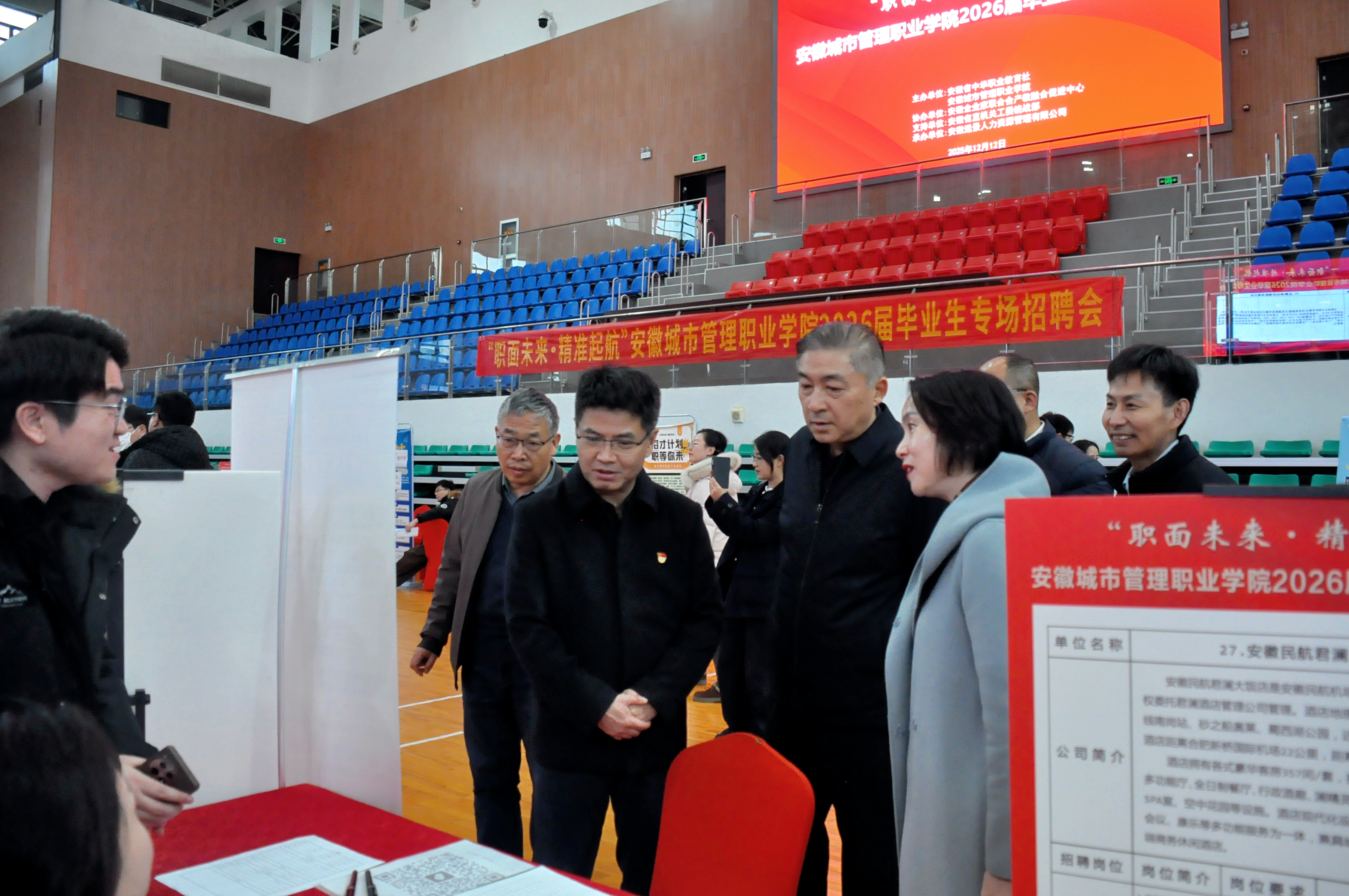 学院党委书记晏祥、副院长聂宗瑶,省直机关工委统战部部长何占说、一级调研员李刚,安徽省中华职业教育社秘书长金兆勇等领导一行深入招聘现场,与用人单位代表亲切交流,与求职学生面对面沟通,详细了解企业用人需求、岗位匹配情况及同学们对学院人才培养的意见建议。
