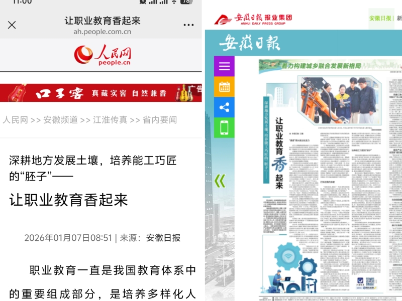 1月7日,《安徽日报》以《深耕地方发展土壤,培养能工巧匠的“胚子”——让职业教育香起来》为题,深度报道了学院在招生就业工作中的创新实践与显著成效,该文同步获得《人民网》转载,获得广泛社会关注。报道从就业形势激发专业结构调整、产教融合、特色专业建设等多个维度,全面展现了学院在服务地方经济发展、培养高素质技术技能人才方面的探索与成果。文章指出,学院通过精准对接市场需求,优化专业布局,实现了招生就业工作的良性循环,为安徽省职业教育高质量发展提供了有益借鉴。